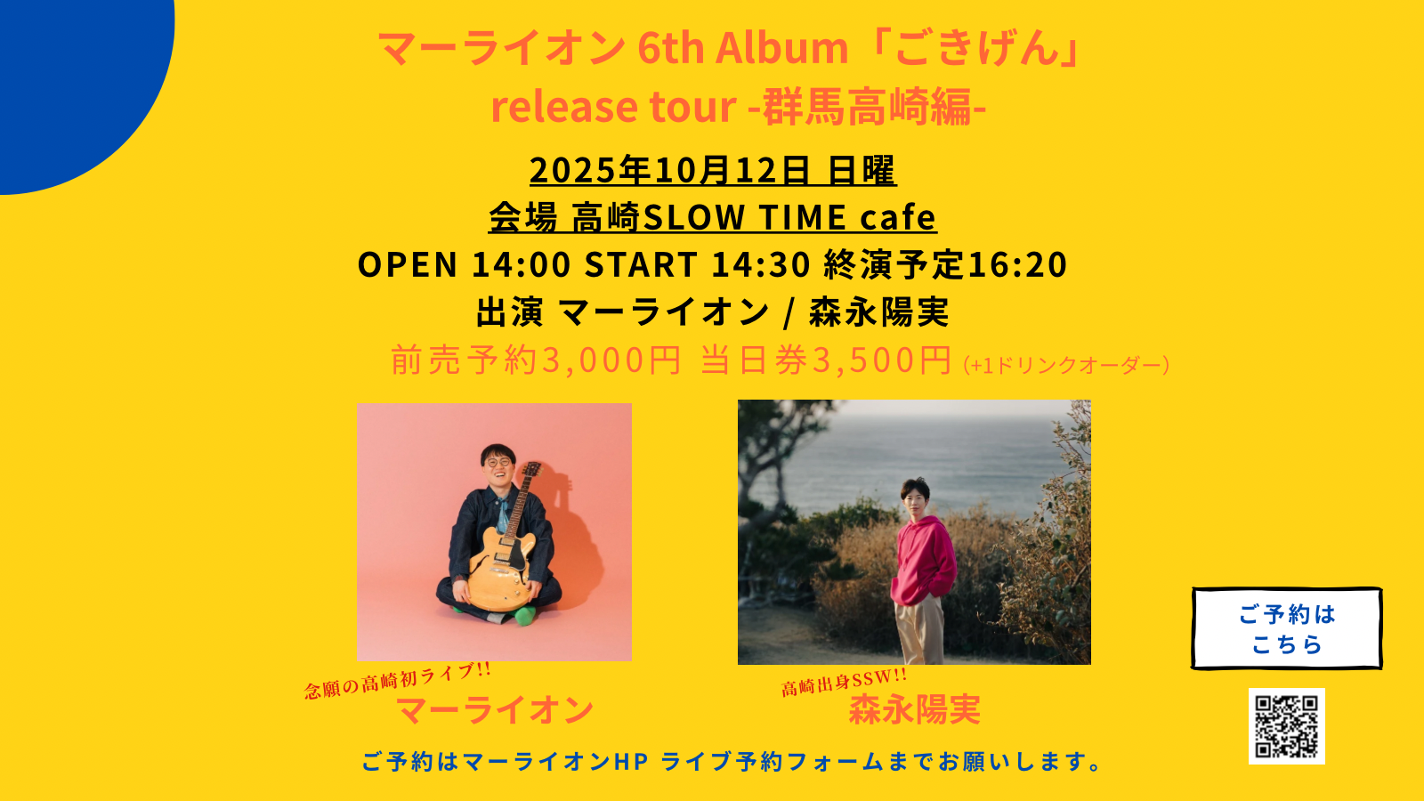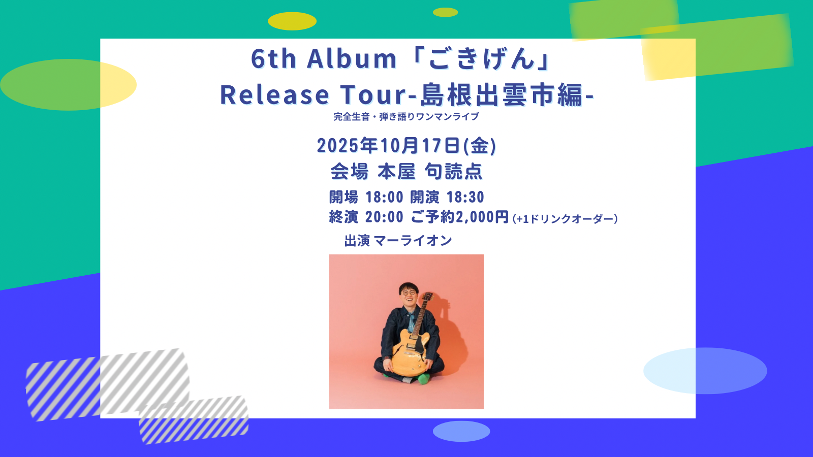 昨年、6th Album「ごきげん」を配信リリースし、今年5月30日には1st詩集「ごきげん」を発売したマーライオンが全国ツアーの追加公演で群馬県高崎、島根出雲市、鳥取青谷を回るライブツアーを開催。